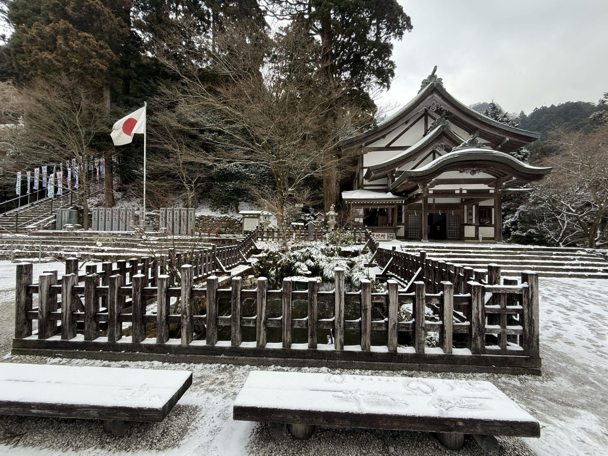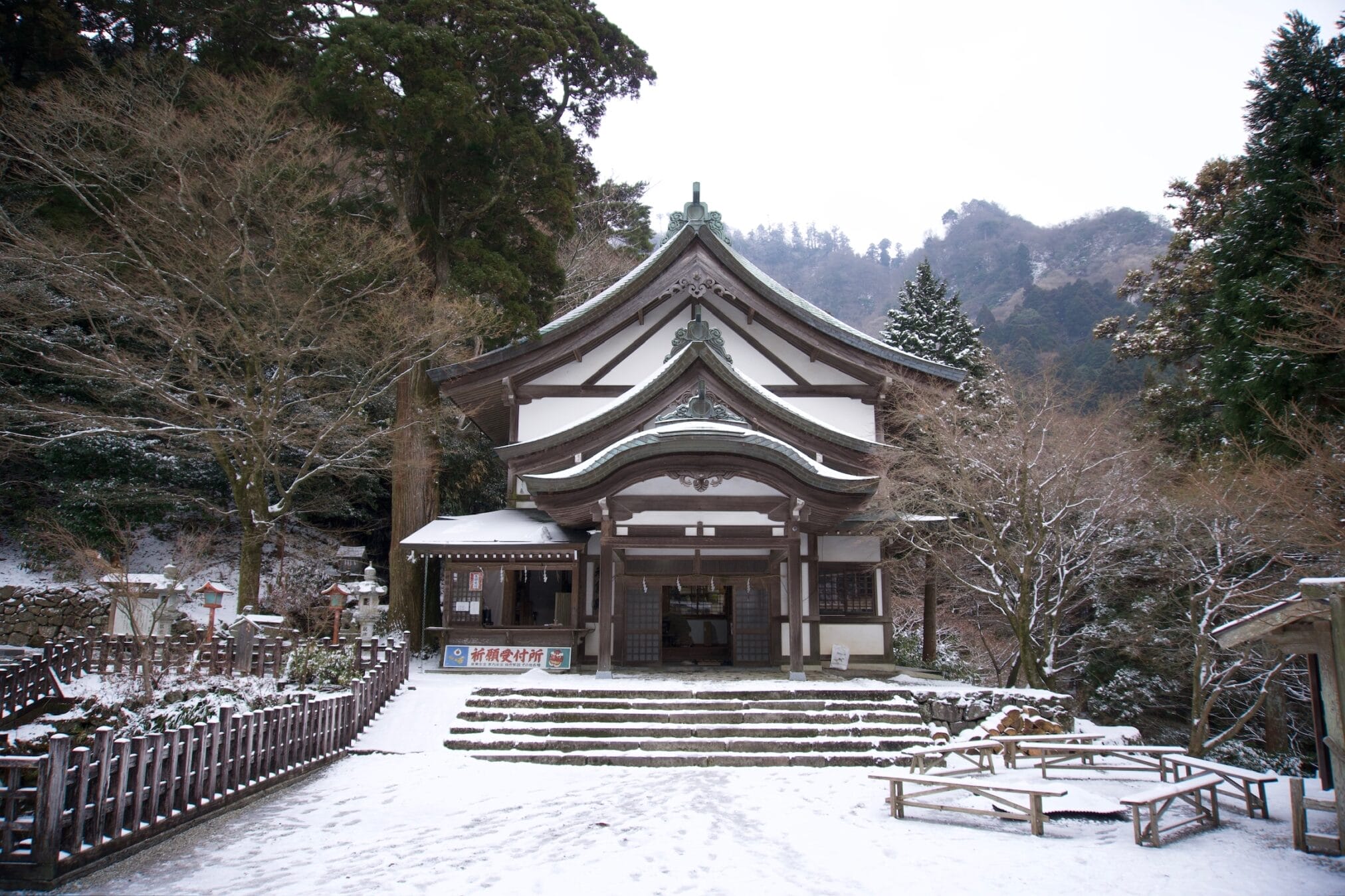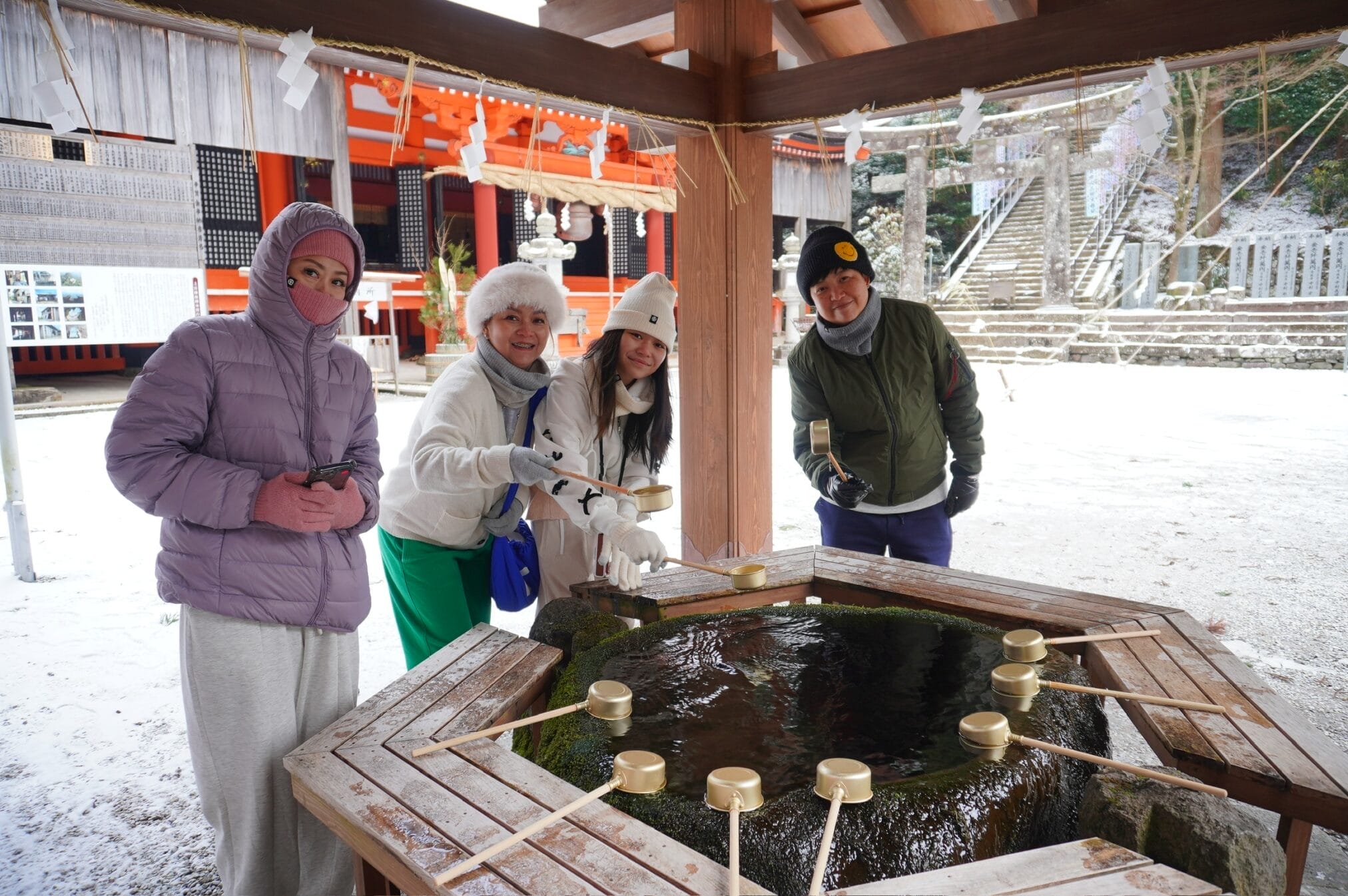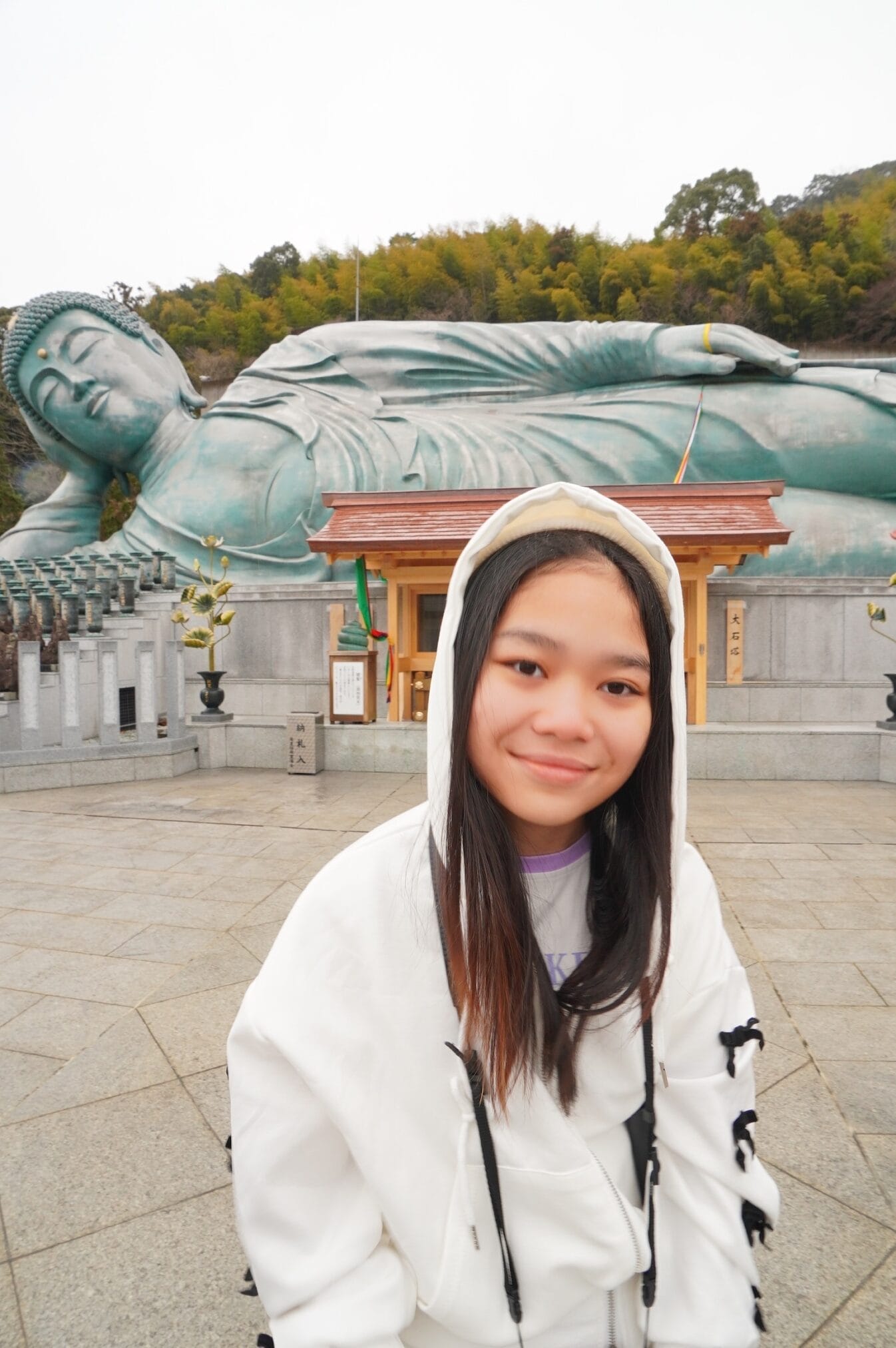 ถึงวัดฝนลงปรอยๆไม่เป็นหิมะแล้ว ที่จอดรถมีสองแบบคือเสียเงินจะได้จอดใกล้ๆ ส่วนฟรีเดินไกล เราเลือกจอดเสียเงินอยู่ติดกับทางเดินเข้าเลย ระหว่างทางลมแรงเเละหนาวมาก รีวิวท่านอื่นว่าให้มาขอหวยโชคลาภ…….ใช่แล้วเราถูกหวยเย็นนั้นเลย ได้ทุนไปเที่ยวต่อ